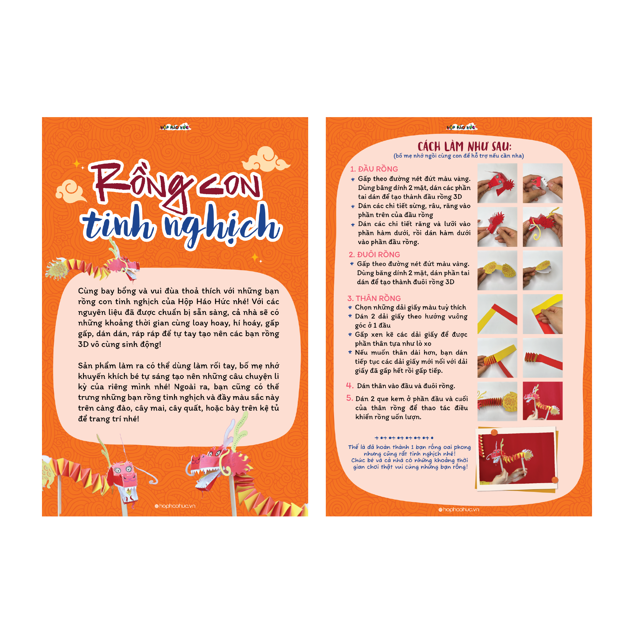 Cùng bay bổng và vui đùa thoả thích với những bạn rồng con tinh nghịch của Hộp Háo Hức nhé! Với các nguyên liệu đã được chuẩn bị sẵn sàng, cả nhà sẽ có những khoảng thời gian cùng loay hoay, hí hoáy, gấp gấp, dán dán, ráp ráp để tự tay tạo nên các bạn rồng 3D vô cùng sinh động!